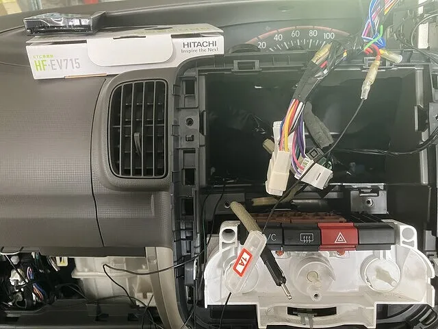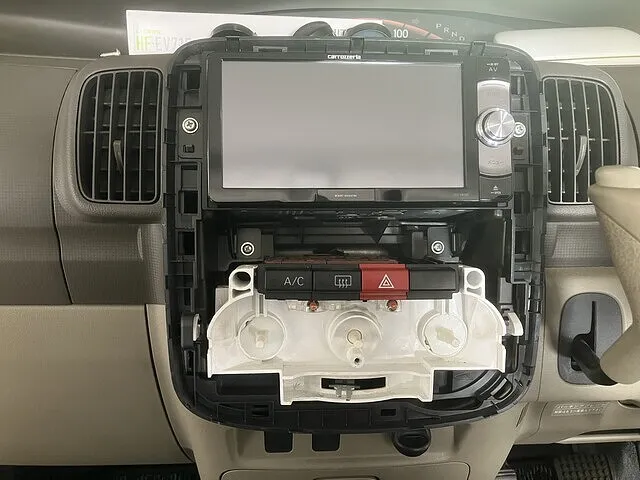 今回はもともと付いていた社外ナビの裏の配線から電源を取る事にしたので、カーナビを外せる状態までナビ、エアコン周りのパネルを外していきます。