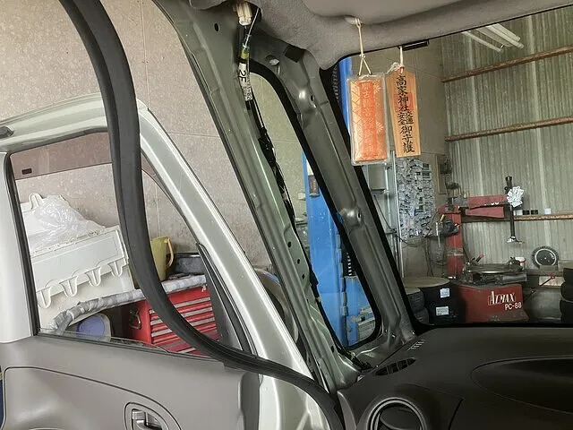 フロントガラスの上部中央にETCのアンテナを貼り付け、配線を隠していきます。車両、フロントガラスの角度によってはアンテナの取付箇所は変わります。